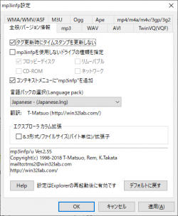「mp3infp/u」は、K.Takata氏が開発した「mp3infp」の拡張版で、Unicodeのファイル名とタグに対応しているほか、設定ダイアログがコントールパネルから独立し、スタートメニューから直接起動できるようになっている。